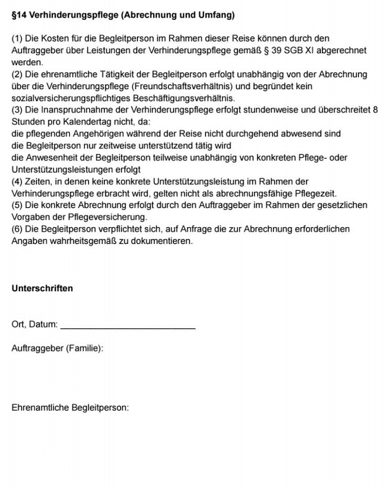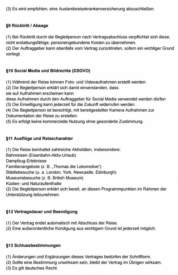 Dieser schriftliche Vertrag dient zur Absicherung beider Seiten für die ehrenamtliche Begleitung einer achtköpfigen Familie mit besonderen Bedürfnissen (Muster Großbrittanien). Festgelegt sind Aufgaben der Begleitperson (vor allem organisatorische und unterstützende Hilfe im Alltag), sowie Regelungen zu Kosten, Unterkunft, Haftung, Versicherung und rechtlichen Rahmenbedingungen. Die Tätigkeit ist ausdrücklich unbezahlt und begründet kein Arbeitsverhältnis. Zusätzlich werden Aspekte wie Reiserücktritt, Ablauf der Reise, Social-Media-Nutzung und eine mögliche Abrechnung über Verhinderungspflege geregelt.